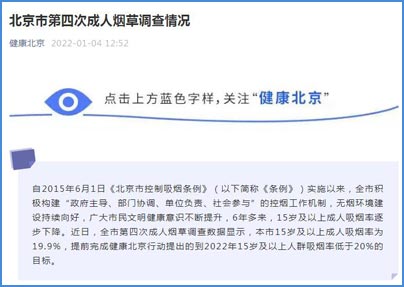 据健康北京微信公众号消息,自2015年6月1日《北京市控制吸烟条例》(以下简称《条例》)实施以来,北京市积极构建“政府主导、部门协调、单位负责、社会参与”的控烟工作机制,无烟环境建设持续向好,广大市民文明健康意识不断提升,6年多来,15岁及以上成人吸烟率逐步下降。近日,北京市第四次成人烟草调查数据显示,本市15岁及以上成人吸烟率为19.9%,提前完成健康北京行动提出的到2022年15岁及以上人群吸烟率低于20%的目标。